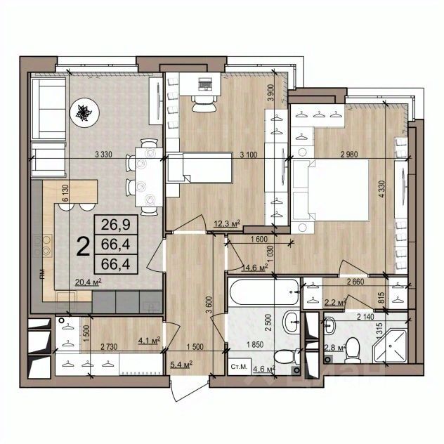 66,4 м²