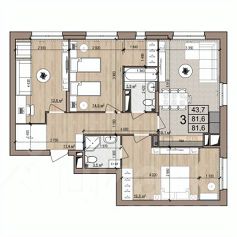 3 комн. квартира в ЖК Полярная Звезда, площадь 81.6 м², жилая 43.7 м², кухня 19.1 м²