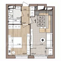 1 комн. квартира в ЖК Полярная Звезда, площадь 42.4 м², жилая 14 м², кухня 19.8 м²