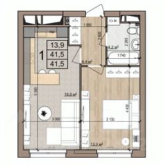 1 комн. квартира в ЖК Полярная Звезда, площадь 41.5 м², жилая 13.9 м², кухня 19 м²