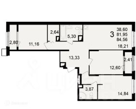 3 комн. квартира в ЖК Макроквартал "Свобода", площадь 84.56 м², жилая 38.6 м², кухня 18.21 м²