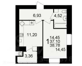 1 комн. квартира в ЖК Видный, площадь 38.78 м², жилая 14.45 м², кухня 11.2 м²