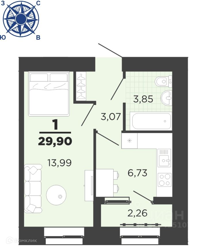 1 комн. квартира в ЖК "Юный", площадь 29.9 м², жилая 13.99 м², кухня 6.73 м²