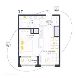 1 комн. квартира в ЖК Космос, площадь 39.78 м², жилая м², кухня м²