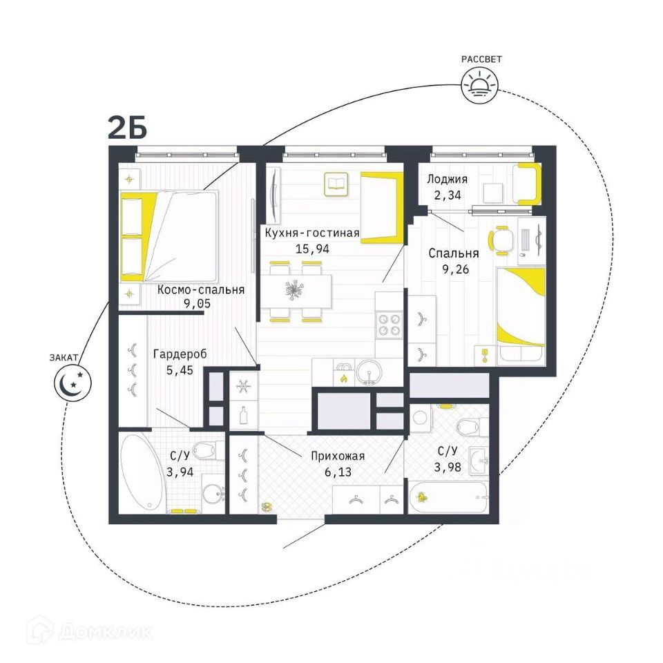 2 комн. квартира в ЖК Космос, площадь 54.92 м², жилая м², кухня м²