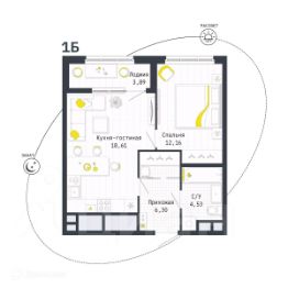 1 комн. квартира в ЖК Космос, площадь 43.55 м², жилая м², кухня м²