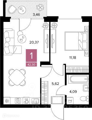 1 комн. квартира в ЖК Квартал Дягилев, площадь 42.3 м², жилая 11.18 м², кухня 20.37 м²