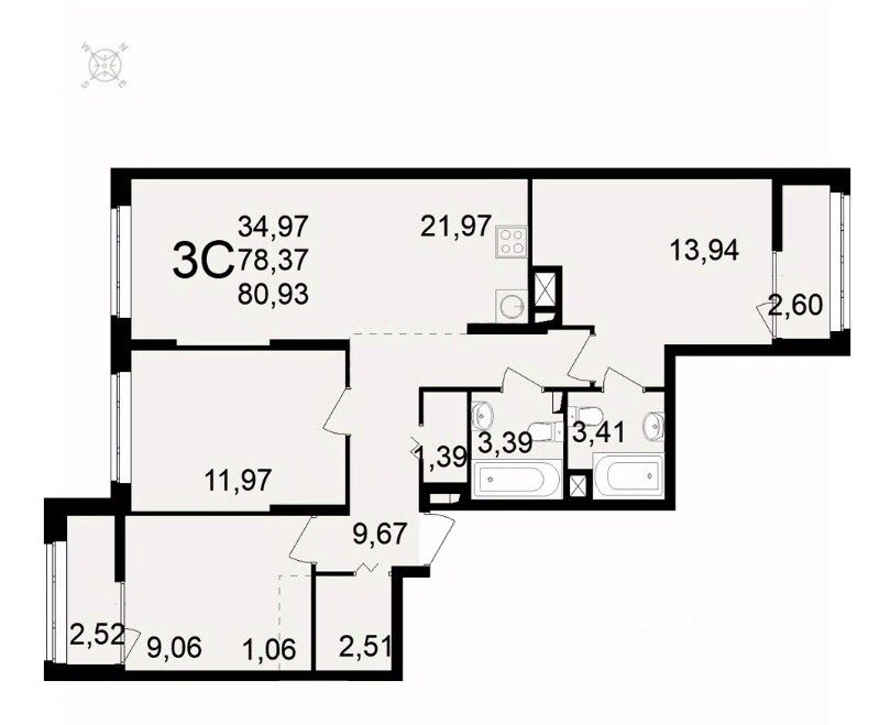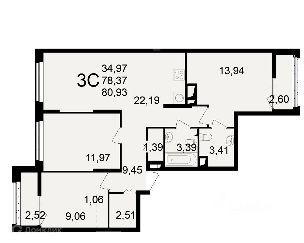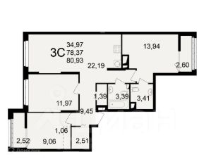 3 комн. квартира в ЖК"Новое измерение", площадь 80.93 м², жилая 34.97 м², кухня 22.19 м²