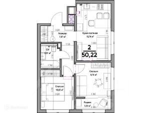 2 комн. квартира в ЖК Аструм, площадь 50.22 м², жилая 19.78 м², кухня 15.74 м²