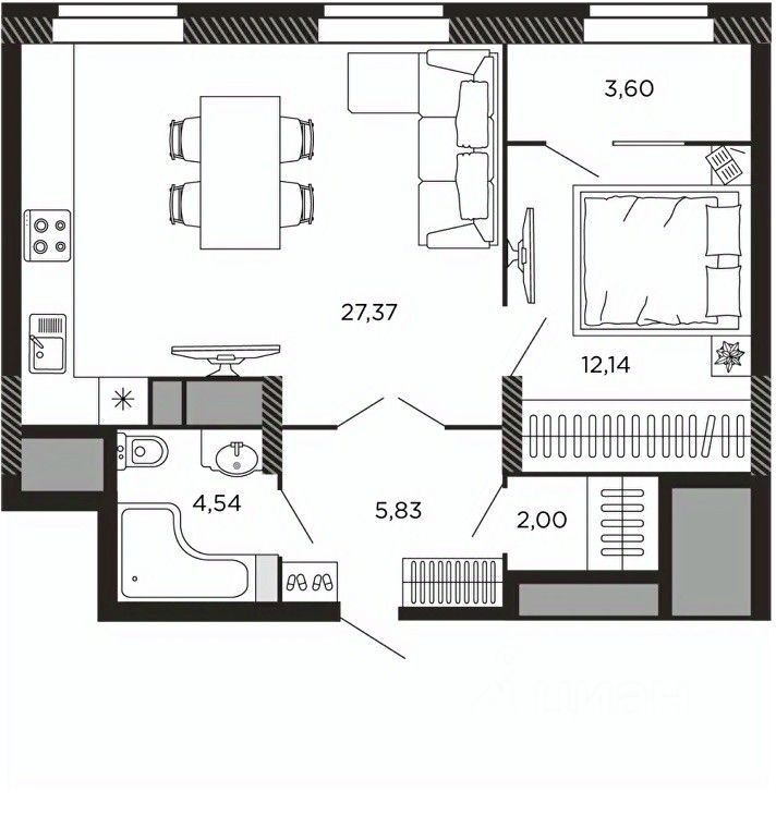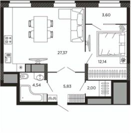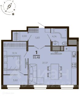1 комн. квартира в ЖК ЖД ТАТЛИН, площадь 55.48 м², жилая 12.14 м², кухня 27.37 м²