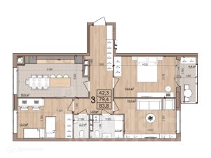 3 комн. квартира в ЖК Skyline (Скайлайн), площадь 83.8 м², жилая 42.3 м², кухня 16.6 м²