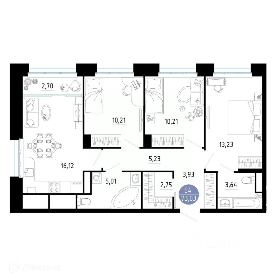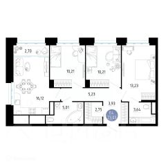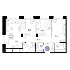 3 комн. квартира в ЖК РОЩА, площадь 73.03 м², жилая 33.65 м², кухня 18.82 м²