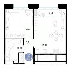 1 комн. квартира в ЖК РОЩА, площадь 43.23 м², жилая 12.21 м², кухня 21.17 м²