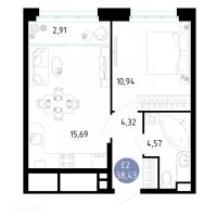 1 комн. квартира в ЖК РОЩА, площадь 38.43 м², жилая 10.94 м², кухня 18.6 м²