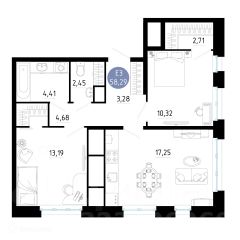 2 комн. квартира в ЖК РОЩА, площадь 58.29 м², жилая 23.51 м², кухня 17.25 м²