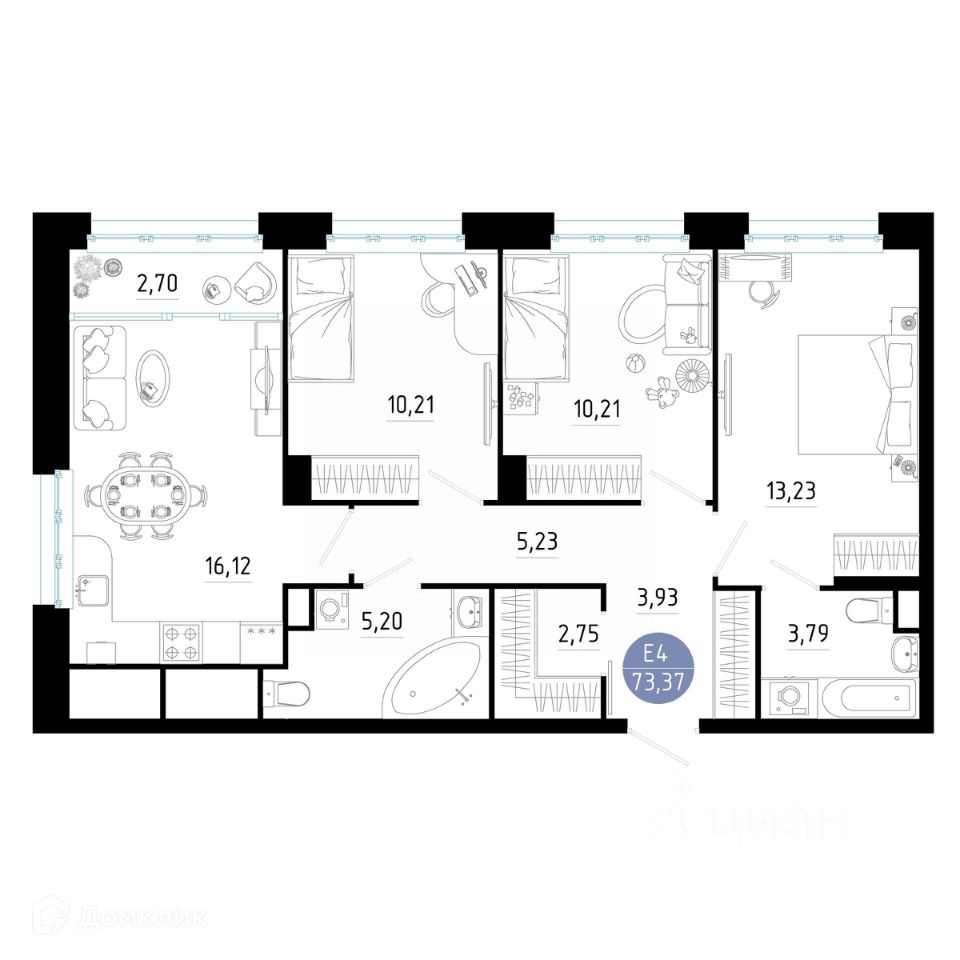 3 комн. квартира в ЖК РОЩА, площадь 73.37 м², жилая 33.65 м², кухня 18.82 м²