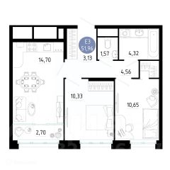2 комн. квартира в ЖК РОЩА, площадь 51.96 м², жилая 20.98 м², кухня 17.4 м²