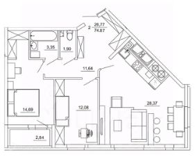 2 комн. квартира в ЖК Смарт Квартал ЦЕНТРАЛЬНЫЙ, площадь 74.87 м², жилая 26.77 м², кухня 28.37 м²