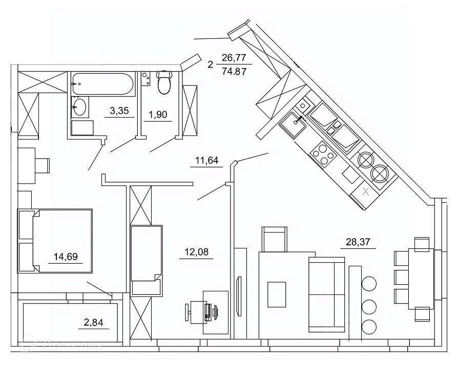 2 комн. квартира в ЖК Смарт Квартал ЦЕНТРАЛЬНЫЙ, площадь 74.87 м², жилая 26.77 м², кухня 28.37 м²