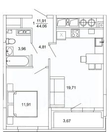 1 комн. квартира в ЖК Смарт Квартал ЦЕНТРАЛЬНЫЙ, площадь 44.06 м², жилая 11.91 м², кухня 19.71 м²