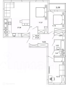 3 комн. квартира в ЖК Смарт Квартал ЦЕНТРАЛЬНЫЙ, площадь 97.26 м², жилая 44.24 м², кухня 27.99 м²