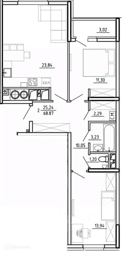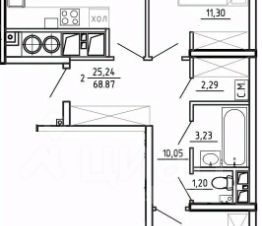 2 комн. квартира в ЖК Смарт Квартал ЦЕНТРАЛЬНЫЙ, площадь 68.87 м², жилая 25.24 м², кухня 23.84 м²