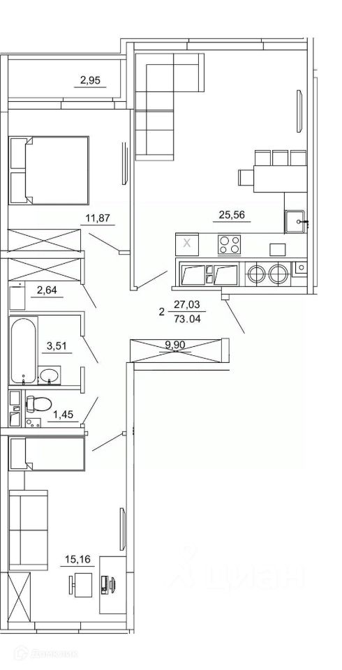 2 комн. квартира в ЖК Смарт Квартал ЦЕНТРАЛЬНЫЙ, площадь 73.04 м², жилая 27.03 м², кухня 25.56 м²