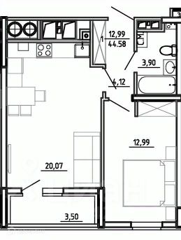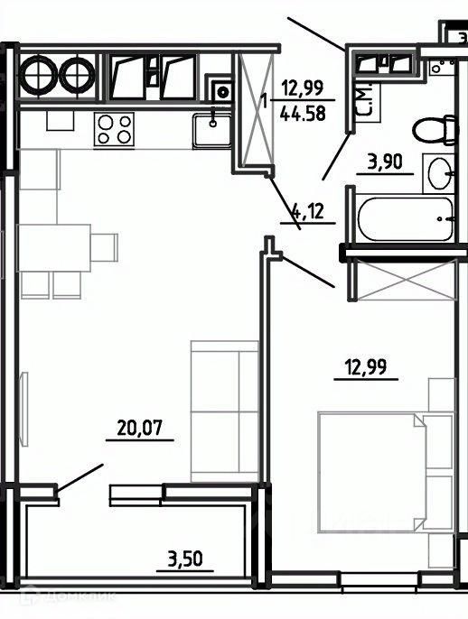 1 комн. квартира в ЖК Смарт Квартал ЦЕНТРАЛЬНЫЙ, площадь 44.58 м², жилая 12.99 м², кухня 20.07 м²