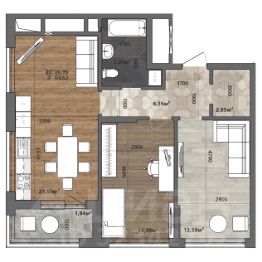 2 комн. квартира в ЖК Счастье II, площадь 64.62 м², жилая 26.99 м², кухня 21.55 м²