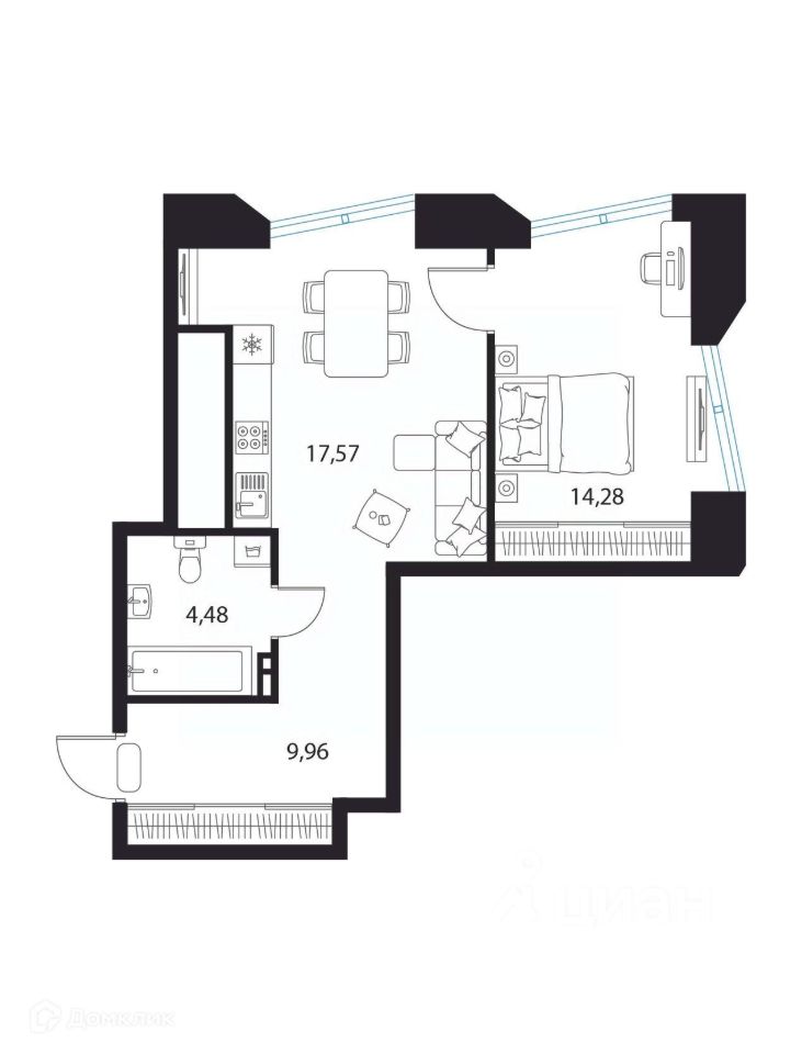 1 комн. квартира в ЖК Манхэттен, площадь 46.29 м², жилая м², кухня м²