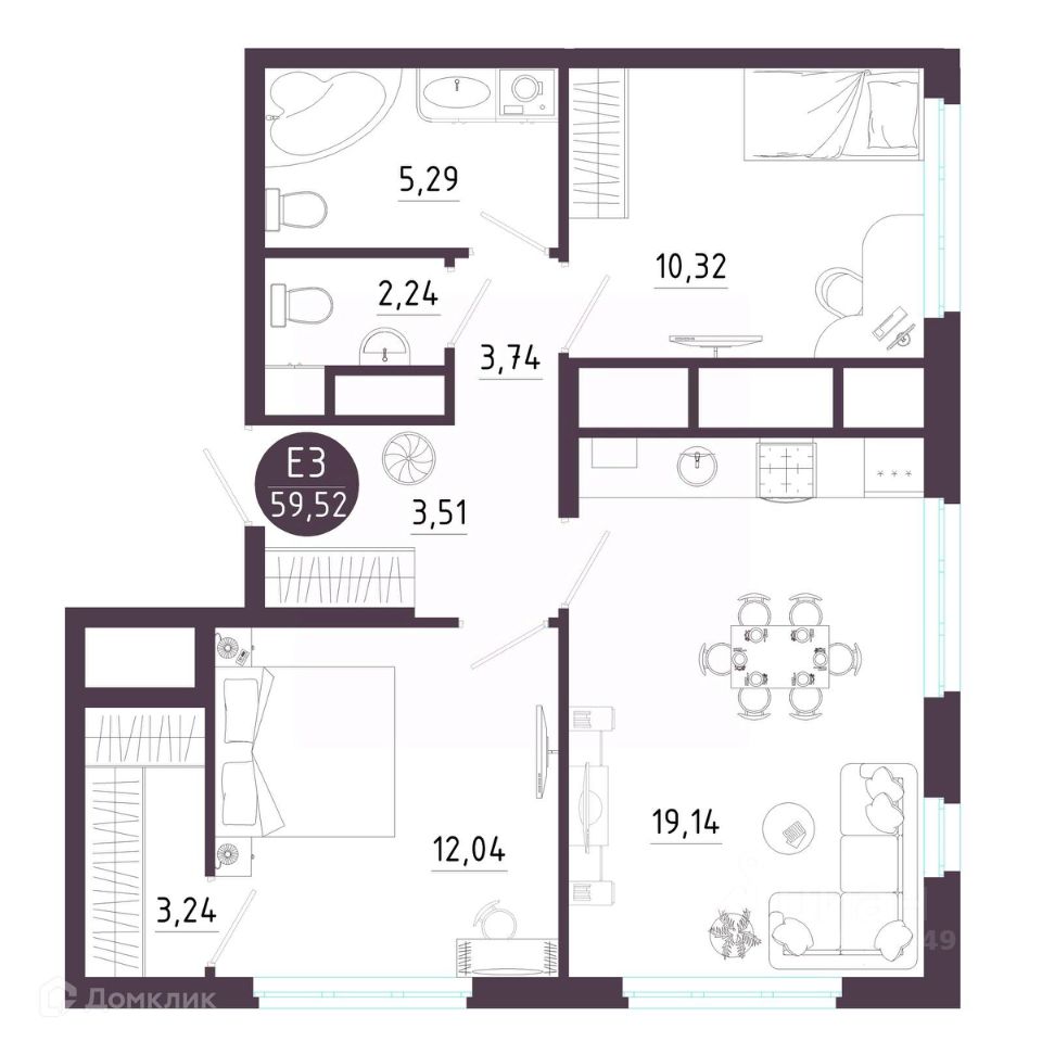 2 комн. квартира в ЖК Крылья, площадь 59.52 м², жилая 22.36 м², кухня 17.06 м²