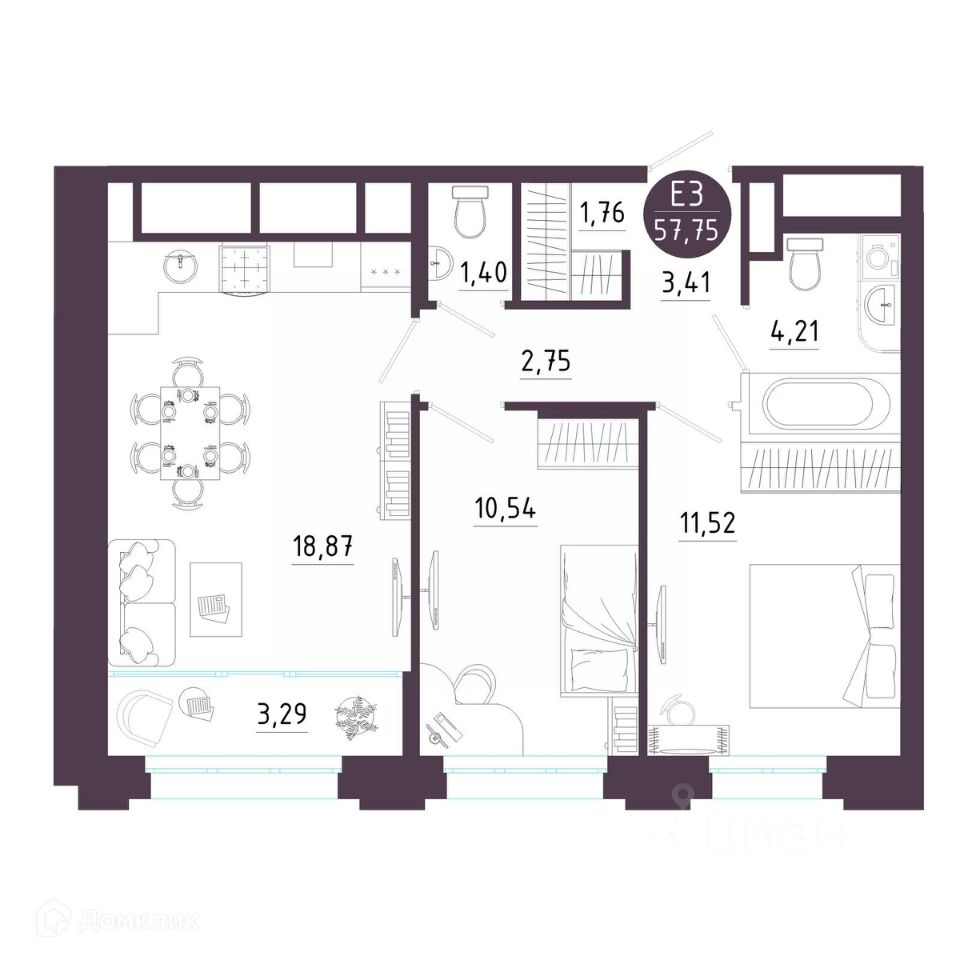 2 комн. квартира в ЖК Крылья, площадь 57.75 м², жилая 22.06 м², кухня 18.87 м²