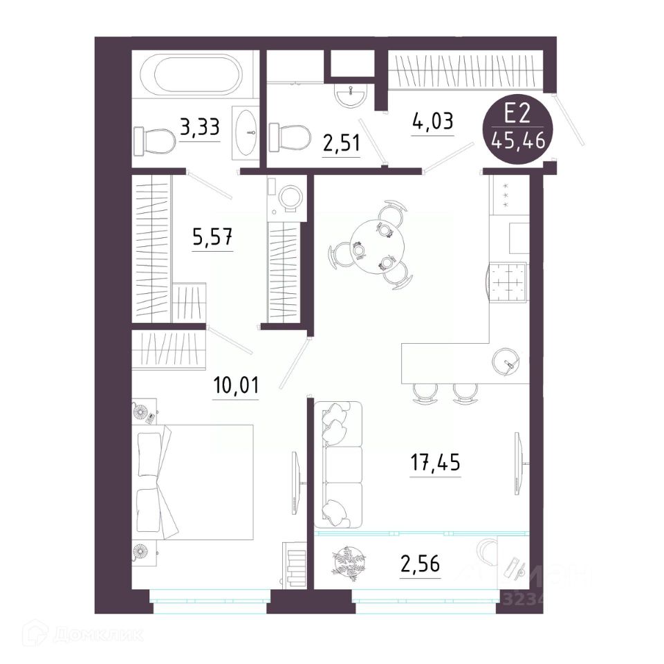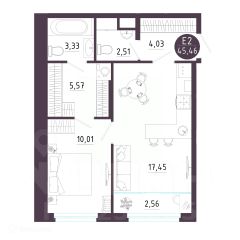 1 комн. квартира в ЖК Крылья, площадь 45.46 м², жилая 10.01 м², кухня 17.45 м²