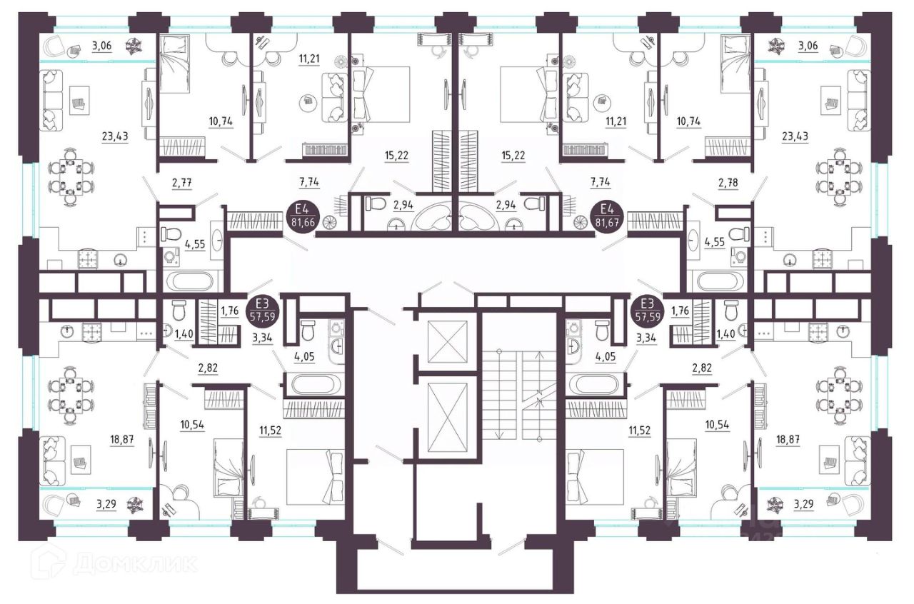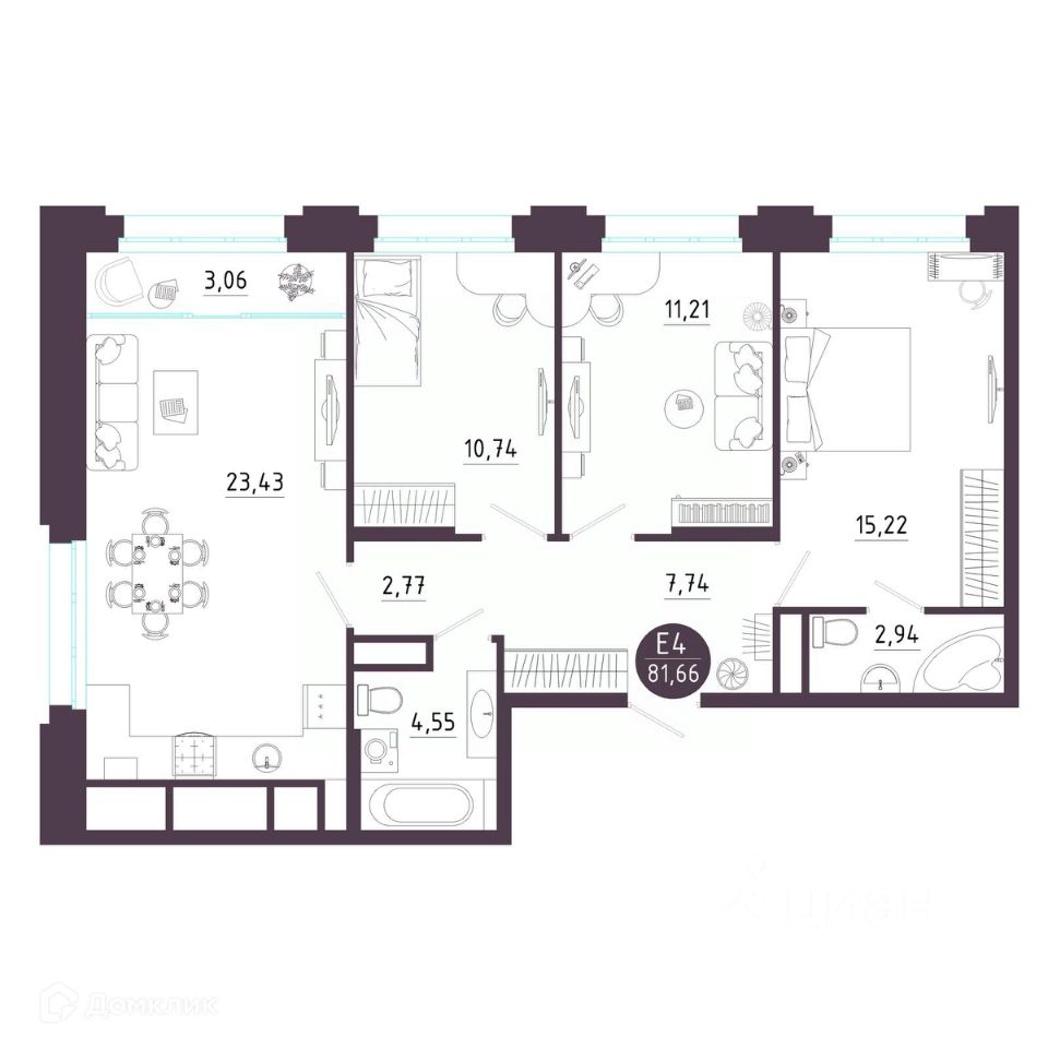 3 комн. квартира в ЖК Крылья, площадь 81.66 м², жилая 37.17 м², кухня 23.43 м²