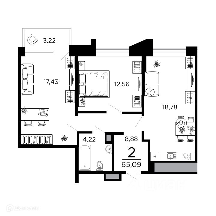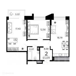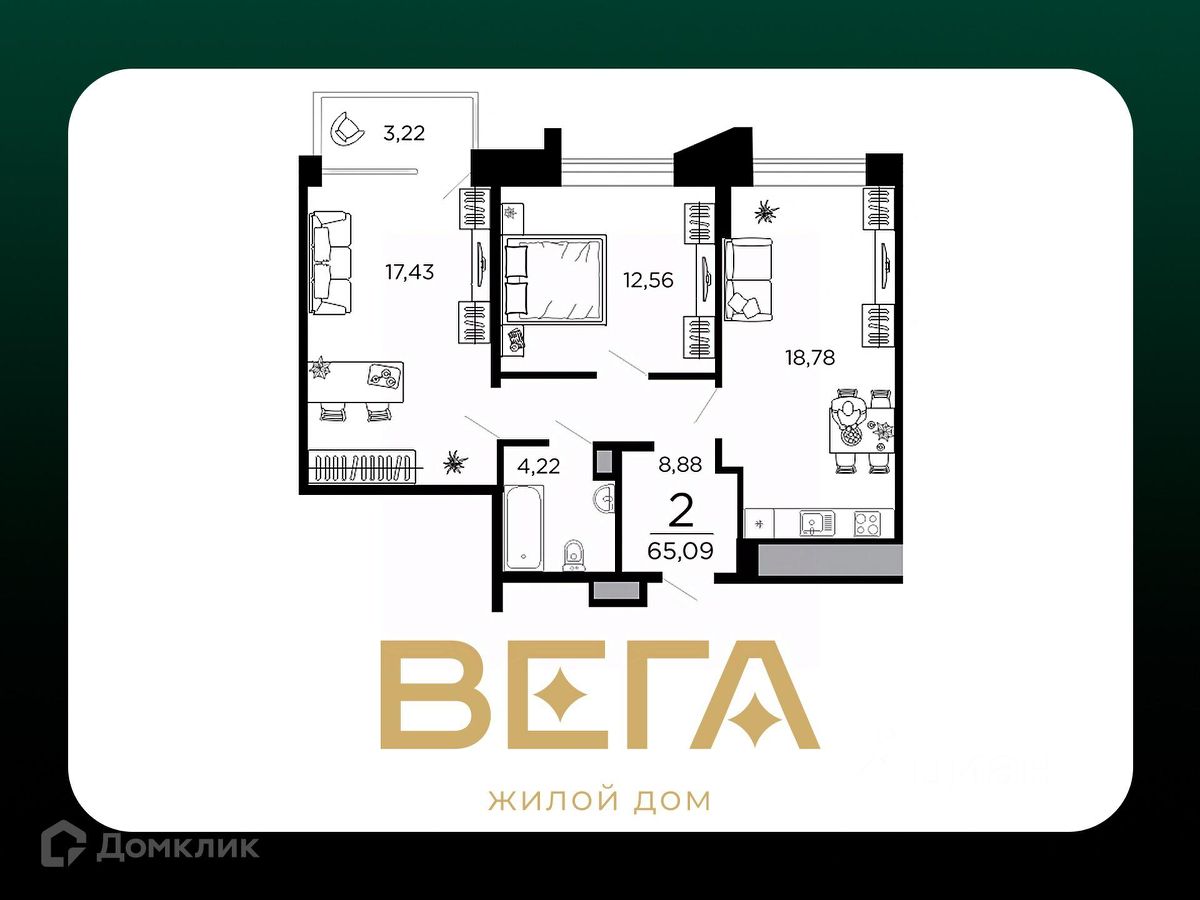 2 комн. квартира в ЖК ВЕГА, площадь 65.09 м², жилая 29.99 м², кухня 18.78 м²