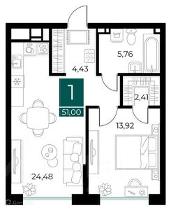 1 комн. квартира в ЖК Арт-кварталы, площадь 51 м², жилая 13.92 м², кухня 24.48 м²