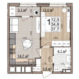 1 комн. квартира в ЖК Еврокласс-5, площадь 37.7 м², жилая 12 м², кухня 14.7 м²