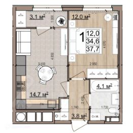 1 комн. квартира в ЖК Еврокласс-5, площадь 37.7 м², жилая 12 м², кухня 14.7 м²