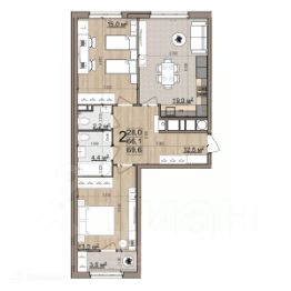 2 комн. квартира в ЖК Еврокласс-5, площадь 69.6 м², жилая 28 м², кухня 19 м²