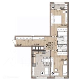 2 комн. квартира в ЖК Еврокласс-5, площадь 71.2 м², жилая 28.7 м², кухня 16.8 м²