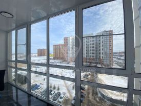 Большая лоджия с панорамными окнами много света и уютное пространство.