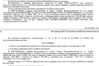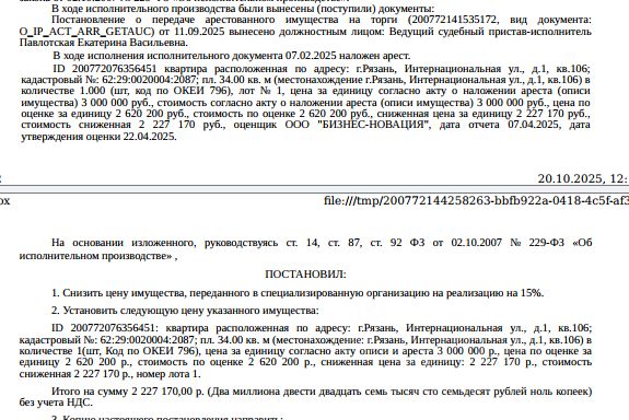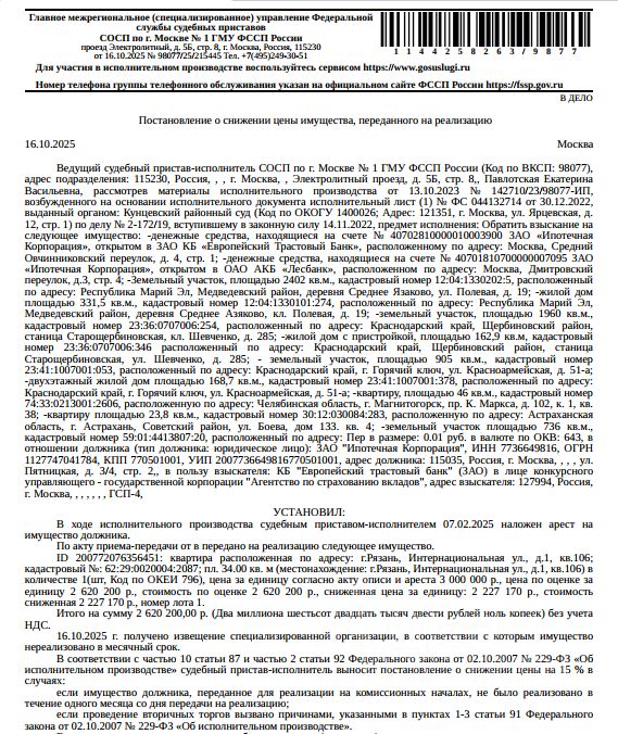 Помещение, жилое, наименование: квартира, площадь 34 кв.м, кадастровый номер 62:29:0020004:2087, местоположение: г.Рязань, Интернациональная ул., д.1, кв.106. Арест на основании постановлений Тверского районного суда г. Москвы. Согласно ответу ООО "Р-Энергия" от 26.08.2025 по данному адресу зарегистрирован 1 человек, задолженность по взносам на кап.ремонт составляет 42 466,68 руб. Решением АСГМ от 06.12.2017 г. по делу А40213068/16 ЗАО "Ипотечная корпорация" признано несостоятельным (банкротом), в отношении него открыто конкурсное производство. Определением АСГМ от 26.04.2021 г. по делу А40213068/16 имущество исключено из конкурсной массы должника. Взыскатель: КБ "Европейский трастовый банк" ЗАО в лице КУ ГК "Агентство по страхованию вкладов".Начальная цена: 2 227 170 (Два миллиона двести двадцать семь тысяч сто семьдесят) руб. 00 коп., без НДС. Задаток: 1 100 000 (Один миллион сто тысяч) руб. 00 коп.Шаг аукциона 1%: 22 271 (Двадцать две тысячи двести семьдесят один) руб. 70 коп