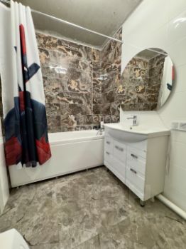 ванная комната выложена керамической плиткой , установлена вся новая сантехника и мебель в ванну;