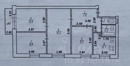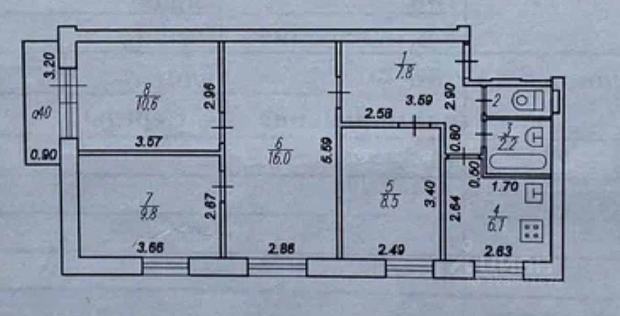 - Жилая площадь: 44,9 м2 (комнаты 9,8+10,6+16+8,5 м2)