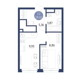 1 комн. квартира в ЖК Бульвар оптимистов, площадь 28.02 м², жилая 8.86 м², кухня 9.93 м²