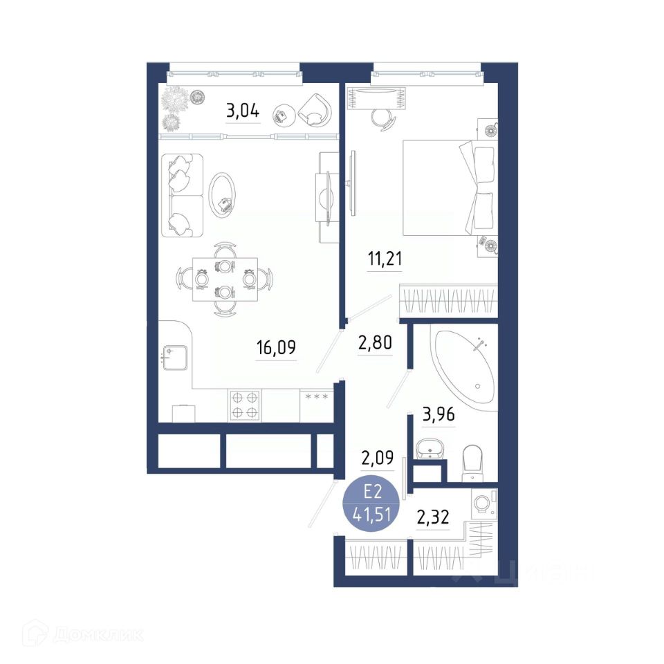 1 комн. квартира в ЖК Бульвар оптимистов, площадь 41.51 м², жилая 11.21 м², кухня 19.13 м²