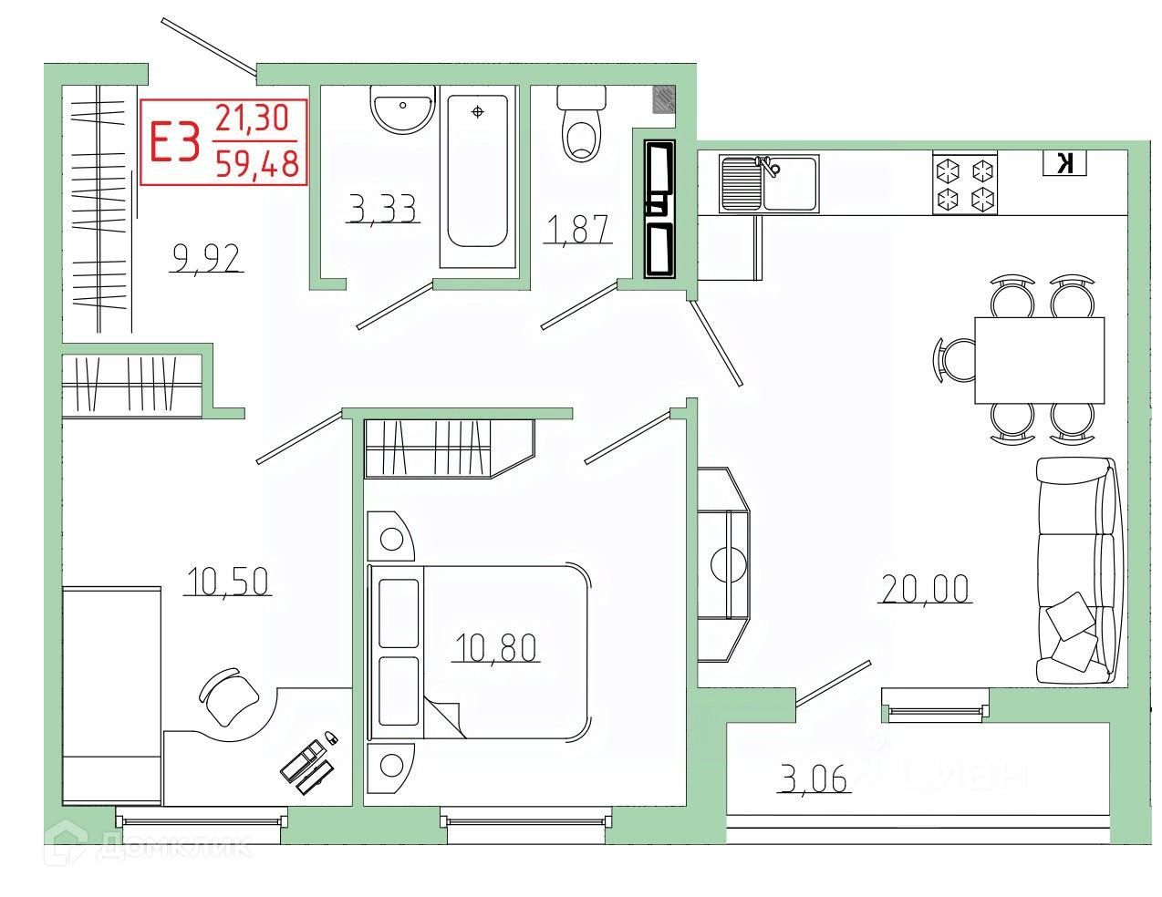 2 комн. квартира в ЖК Бульвар оптимистов, площадь 59.48 м², жилая 21.3 м², кухня 20 м²