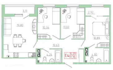3 комн. квартира в ЖК Бульвар оптимистов, площадь 77.75 м², жилая 32.25 м², кухня 19.8 м²