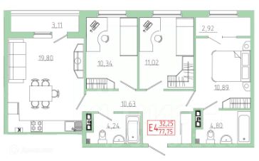 3 комн. квартира в ЖК Бульвар оптимистов, площадь 77.75 м², жилая 32.25 м², кухня 19.8 м²