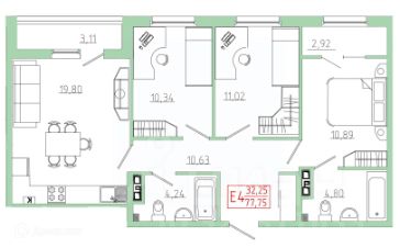 3 комн. квартира в ЖК Бульвар оптимистов, площадь 77.75 м², жилая 32.25 м², кухня 19.8 м²